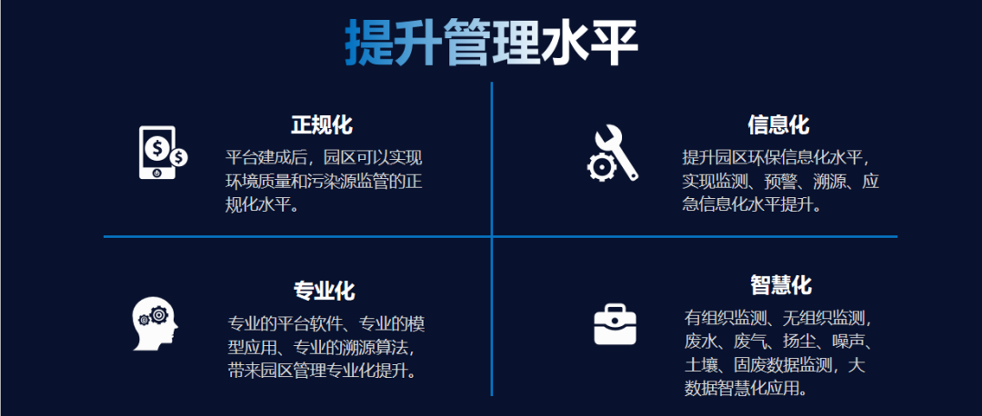 上述国家和省市的标准和文件中,都对工业园区监测预警等内容做了明确的说明,环境监测信息化在园区的建设和评级中,占用非常重要的作用。